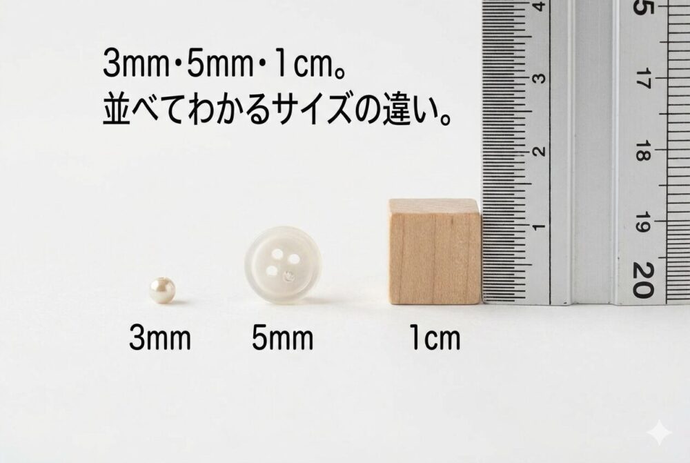 | 5mm | 0.5cm | やや厚みを感じる | ネイルパーツ、ビーズ |
