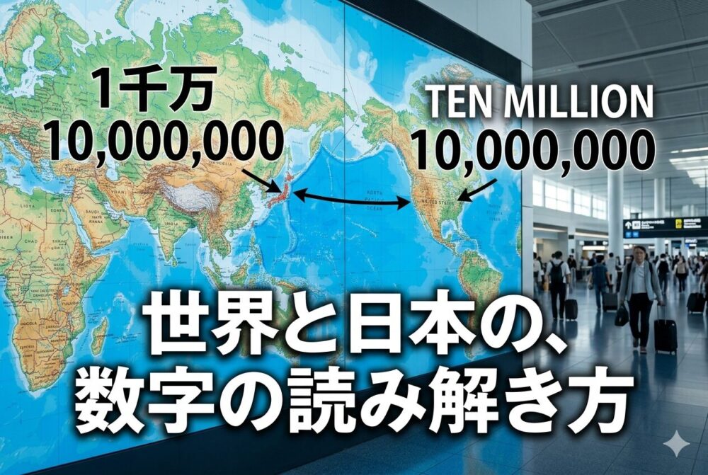 日本語では「万」「億」と4桁ごとに区切りますが、英語は3桁単位で区切るため、同じ数字でも呼び方が変わります。