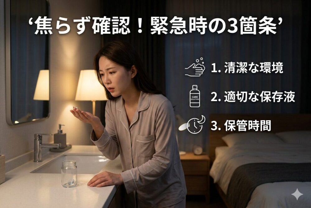 どうしても手に入らない場合は、無理に保管して翌日に使うより、眼鏡に切り替える・ワンデーに交換するなど、目を守る選択を優先しましょう。