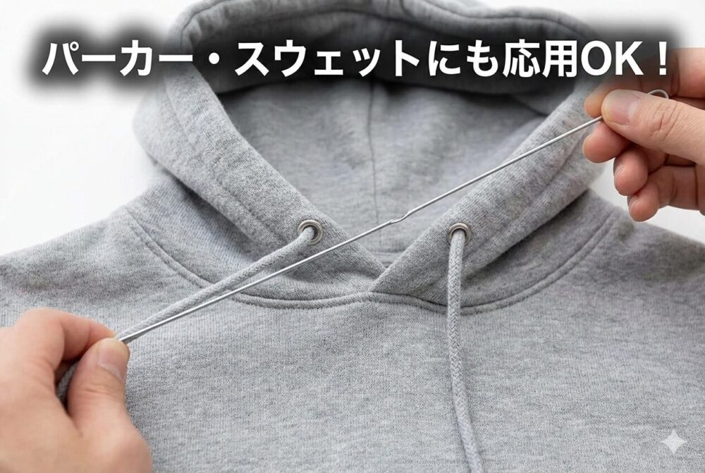 今回ご紹介した方法は、パーカーのフード紐やスウェットパンツ、ジャージなどにも応用できます。