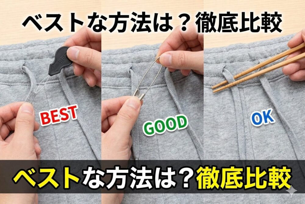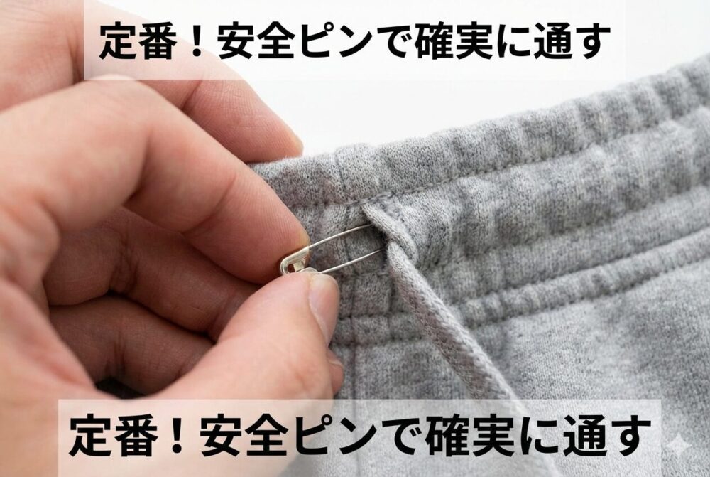 ウエスト部分だけでなく、フードまわりの細い通し口や、少し長めの紐にも同じ手順で対応できるため、覚えておくとさまざまな衣類に役立ちます。